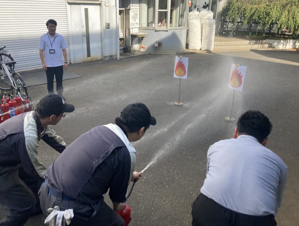 写真は、お借りした訓練用の消火器を用いた訓練です。消火器の中身は本来は粉状ですが、訓練用は水が入っています。弊社では消火器を敷地内の各所に設置している以外に、消火ポンプも整備しています。